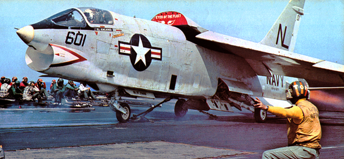 A U.S. Navy Vought RF-8G Crusader from Photographic Reconnaissance Squadron 63 (VFP-63) Det. 5 "Eyes of the Fleet" is launched from the aircraft carrier USS Coral Sea (CVA-43). VFP-63 Det. 5 was assigned to Attack Carrier Air Wing 15 (CVW-15) aboard the Coral Sea for a deployment to Vietnam from 9 March to 8 November 1973. Font: Wikimedia Commons