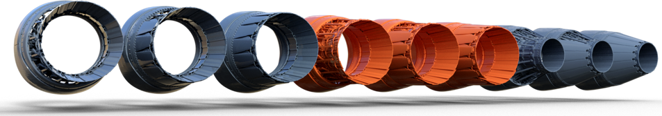 We are showcasing the final design of the J-58 afterburner, along with the fuel injector and air deflector, and the final stage of the compressor turbine.