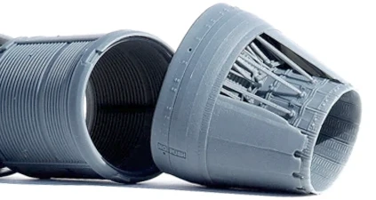 Closed engine nozzle F-100 Pratt & Whitney 229 with afterburner and composite petals, with a few of them unmounted to be mounted on the F-15. As a damaged nozzle, in assembly phase or as an engineering schematic cut to observe the internal mechanisms.